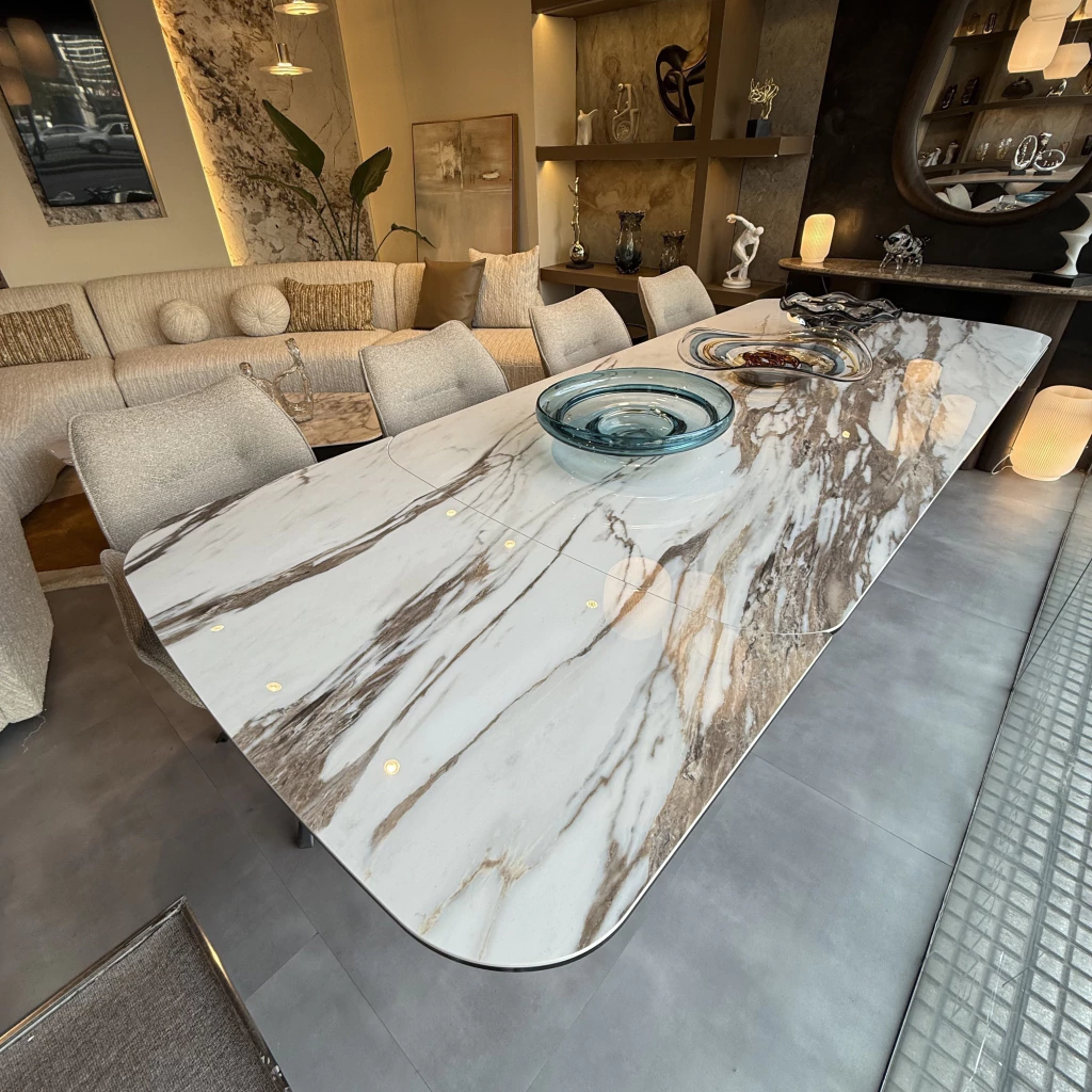 De diseño minimalista, realza el ambiente con su tapa en piedra sinterizada en tonalidad beige con profundas vetas marrones combinada con vidrio templado. Su sistema extensible permite adaptarla a cada ocasión. Las patas combinadas en metal y madera en tono marrón aportan calidez y resistencia, completando un conjunto versátil y sofisticado.