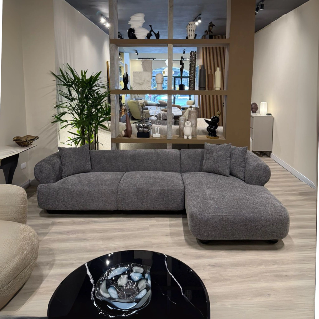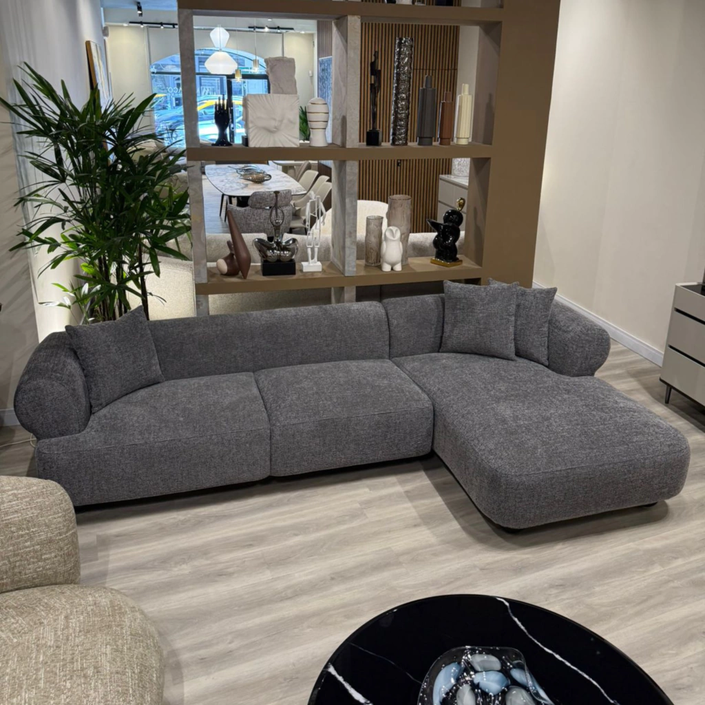 Se presenta en una configuración semi-L con diván, pensada para sumar amplitud y una experiencia de uso más relajada. Su silueta de volúmenes generosos y perfil bajo se equilibra con brazos curvos y envolventes, que suavizan la composición y aportan una presencia cálida y contemporánea. El tapizado en chenille acanalado, en color gris realza esa sensación acogedora con una textura visual amable, mientras que sus apoyos discretos sostienen la pieza con firmeza y ligereza. Un sofá versátil, diseñado para acompañar la vida diaria con estilo sereno y sofisticado.